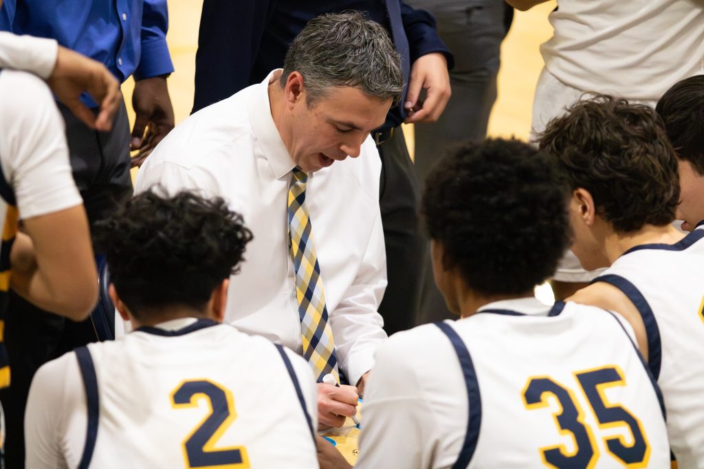 Coach Justin Woody draws up a play during a timeout.