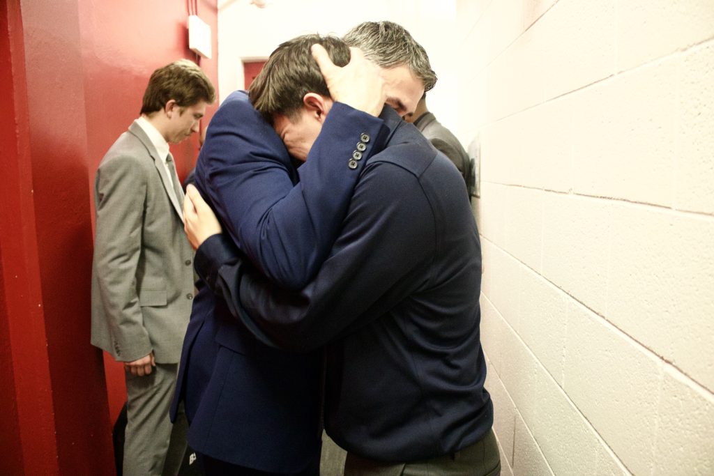 Coach Justin Woody embraces his son and assistant coach, Joseph Woody, after their championship loss in 2025.